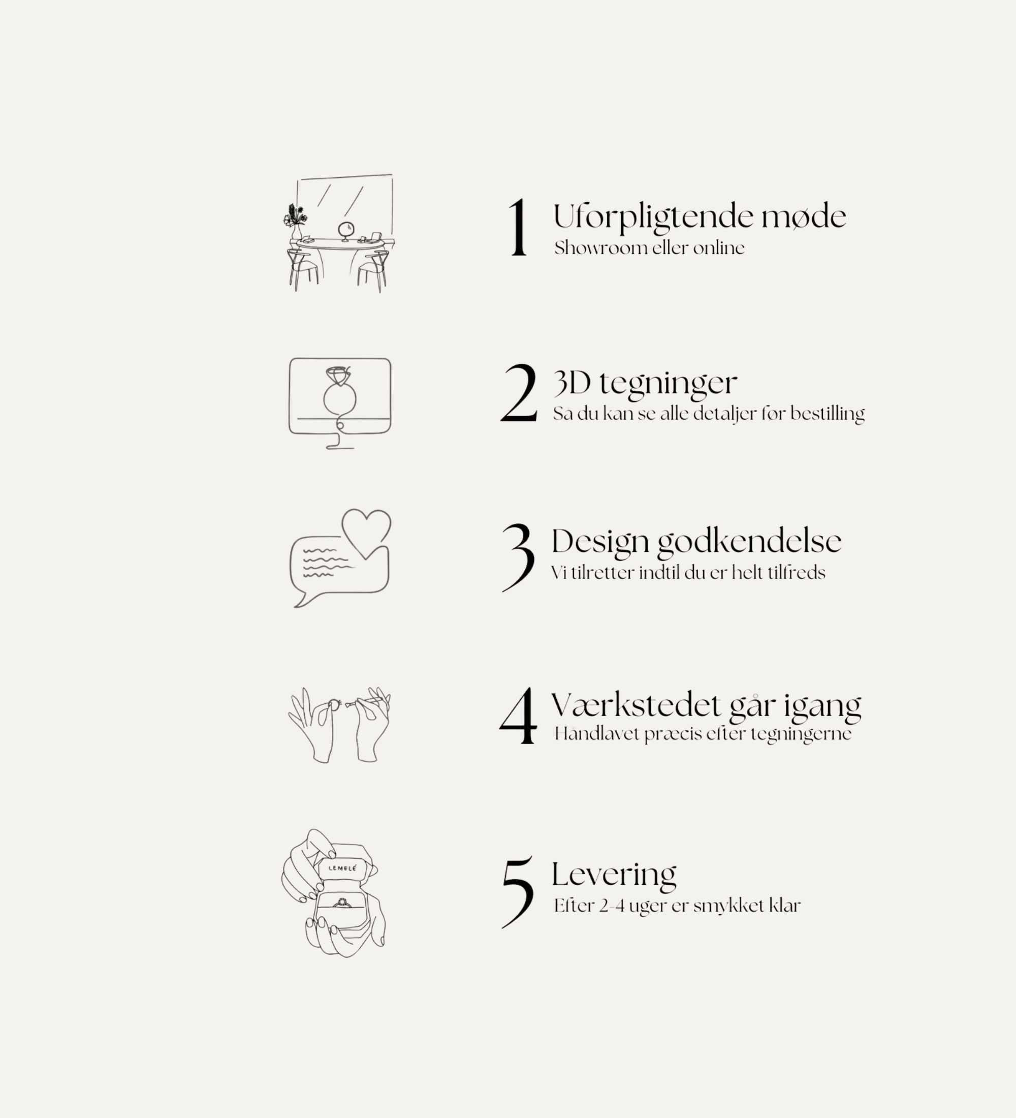 Din vision er vores drivkraft. Hos Lemelé, kan du være sikker på, at hver detalje bliver nøje overvejet. Fra det indledende design til den færdige ring, er din drøm vores mission. Undervejs i processen laver vi altid meget detaljede 3D tegninger af smykket, så du ved præcis hvad du kan forvente.